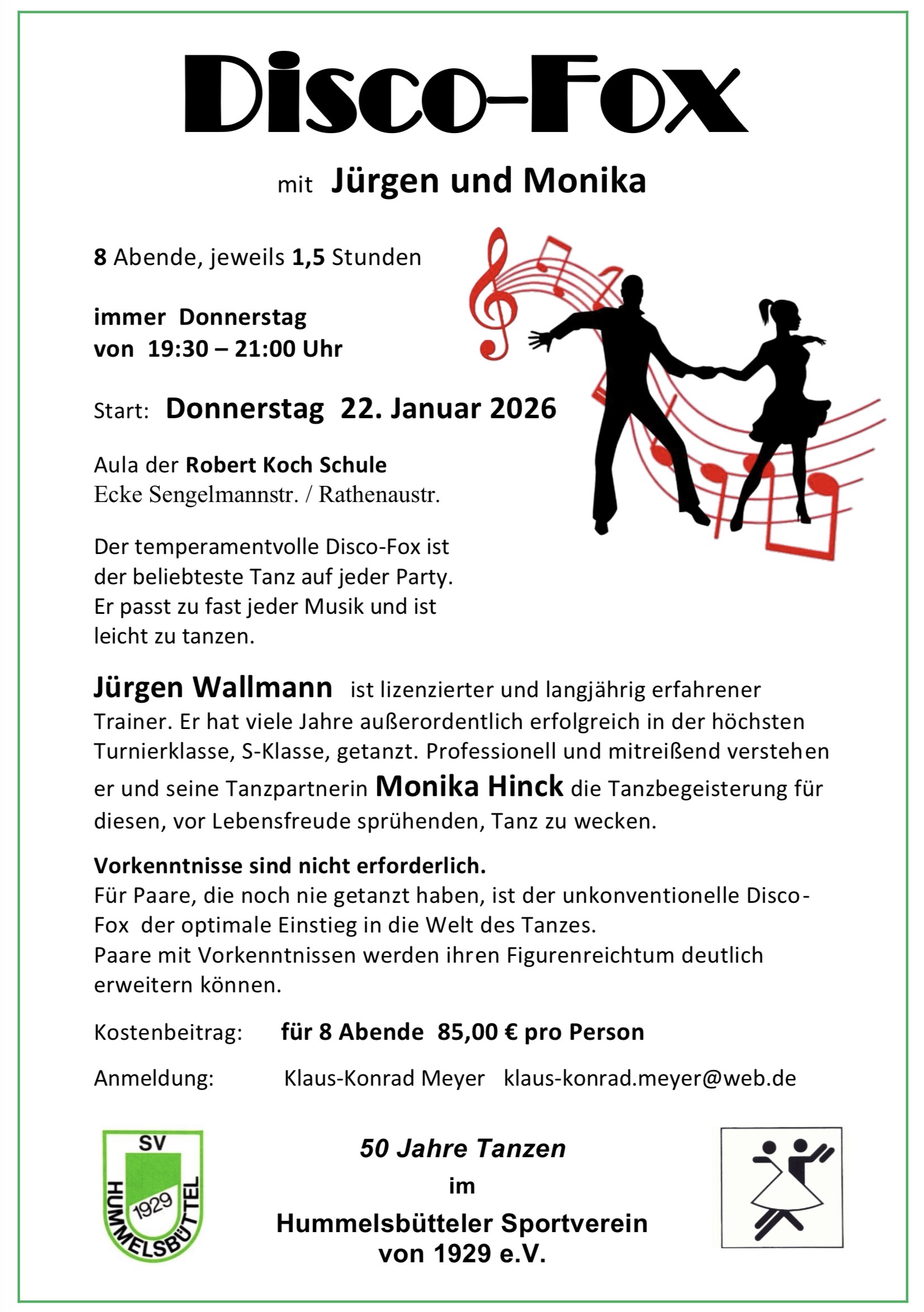 Diesen Kurs gibt es nur einmal im Jahr beim HuSV, immer zu Beginn eines neuen Jahres. In den Tanzkreisen wird u.a. auch Disco Fox getanzt. Aber eben nicht in dieser Intensität wie im Kurs.